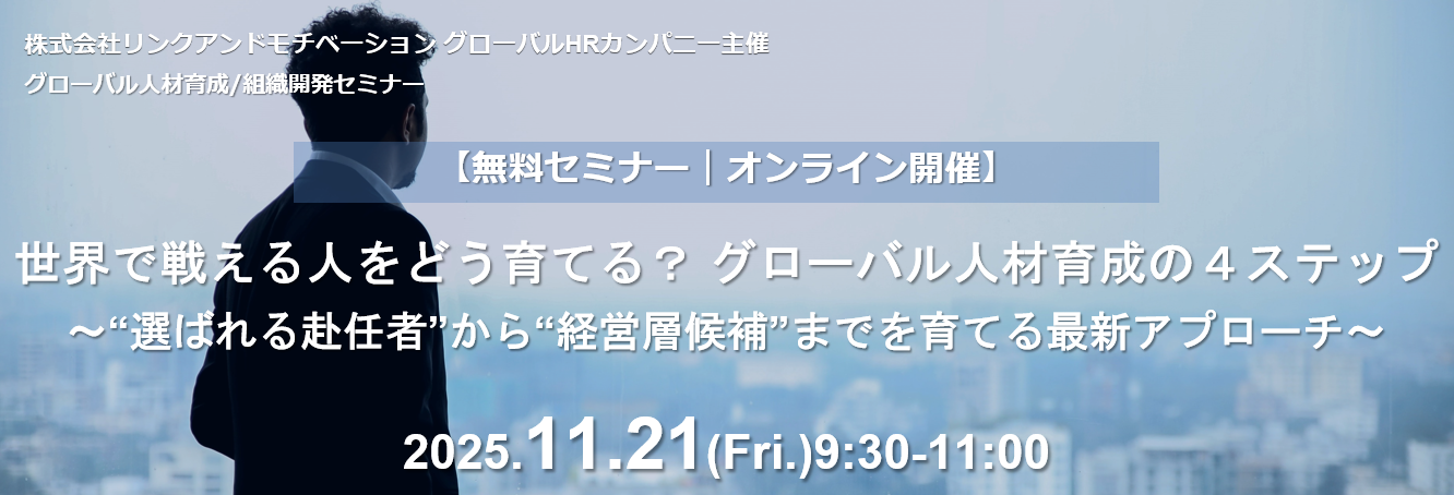 | 内容 | <概要> 「海外赴任を任せられる人材が見つからない」 「グローバル人材の育成を試みても、現地で成果を出せない」 「せっかく育てても、帰任後に活躍の場がない」 「選抜育成が属人的で、仕組み化できていない」 「次世代経営層候補を計画的に育成できていない」 こうした課題は、グローバル展開を加速させる多くの企業に共通する悩みとなっています。 人的資本経営が注目されるいま人事・経営層に求められるのは、 「グローバルで戦える人材を、戦略的に育てる仕組みづくり」です。 しかし現実には、 ・海外赴任者の選抜基準があいまい ・現地で成果を出すための育成・支援が不足 ・帰任後のキャリアパスが不明確 ・グローバル人材の成長を可視化する仕組みがない といった、“成長が止まるポイント”が存在します。 本セミナーでは、グローバル人材育成を「4つのステップ」で体系的に整理し、 “選ばれる赴任者”から“経営層候補”までを一貫して育てる最新の仕組みづくりを解説します。 “グローバルで戦える人”を計画的に育てるために。 理論と実践を融合させた育成の最新アプローチを、ぜひこの機会にお持ち帰りください。 <このような方にお勧めいたします> ・グローバル人事や海外赴任制度の企画・制度設計に携わる人事部門のご担当者様 ・駐在員向けの赴任前教育や研修プログラムの立案・運営をご担当されている方 ・駐在員の育成・配置・支援に関わる本社の海外事業部門の方 ・グローバル人材育成や次世代リーダー戦略を推進する経営企画・人事企画部門の方 <開催形式> オンライン(Zoom) |